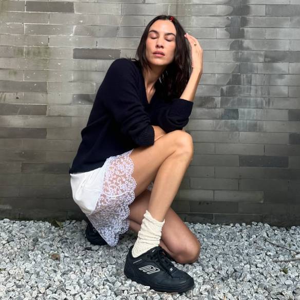 스타일링 장인 알렉사 청의 블랙 스니커즈 룩입니다. 스니커즈 스타일링에서도 믹스 매치 트렌드는 계속될 것으로 보입니다. 빈티지한 느낌의 가죽 운동화를 의외의 페미닌한 레이스 장식 스커트와 매치해 본인만의 노련한 스타일링 감각을 보여줬습니다. 카디건과 도톰한 슬라우치 양말로 가을의 계절감을 더해준다면 금상첨화겠죠!