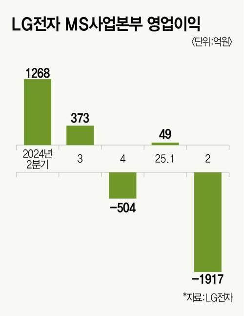 TV 사업을 담당하는 MS사업본부는 올 2분기에만 1917억원 영업손실을 냈다. 지난해 2분기까지만 해도 1268억원 흑자를 냈던 것과 대비된다. LG전자 주요 사업부 중 유일한 적자다. 2분기 매출도 전년 동기 대비 13.5% 감소한 4조3934억원에 그쳤다.