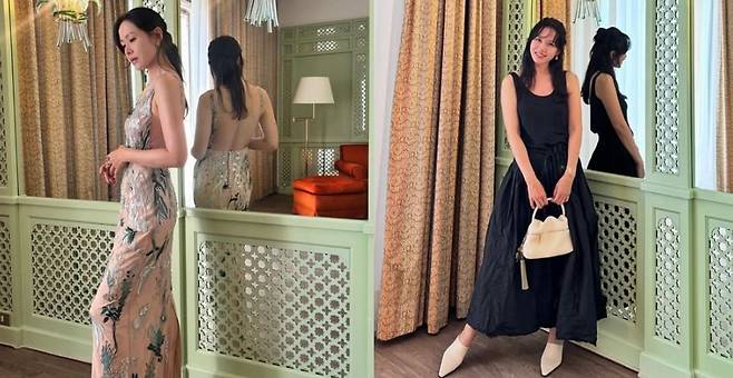 손예진은 2일 자신의 소셜 계정에 "드레스 입으려고 탄수화물 안 먹다가 끝나고 칼로리 폭탄"이라는 글과 함께 여러 장의 사진을 게시했다.