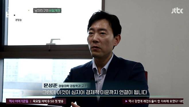 문성준 경찰대 교수는 "여자가 도구화된거다. 수요자들에게 새로운 콘텐츠를 공급해주면서 핵심적인 인물로 떠오르는 것에 대해 존재감을 느꼈을 거다. 심지어 경제적 이윤까지 연결이 된다. 그렇다면 남성의 입장에서 새로운 여성을 만나고 관계를 유지하려는 시도는 계속되는 거다"라고 설명했다.