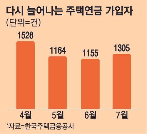 지지난 1월 762건, 2월 979건에 그쳤던 주택연금 신규 가입 건수는 3월 들어 1360건으로 늘었다가 4월 1528건으로 치솟았다. 그러나 집값이 올 3월을 기점으로 뛰기 시작하면서 5월(1164건)과 6월(1155건)에 두 달 연속으로 줄었다.