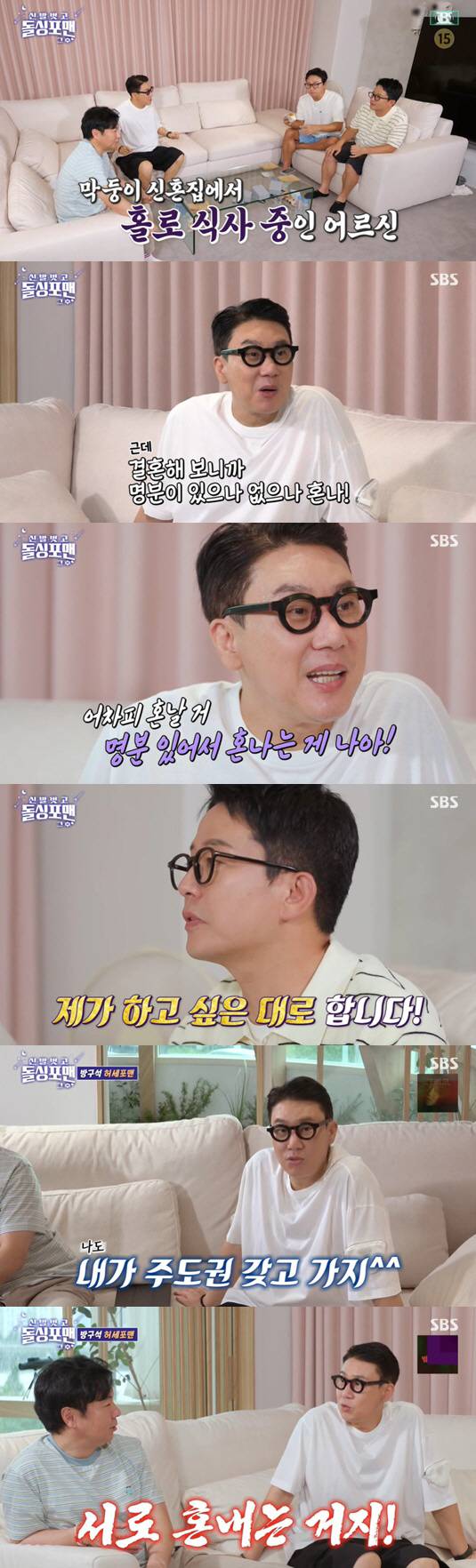 이날 탁재훈은 김준호의 신혼집에서 음식을 먹으며 쇼파에 묻혔다. 이에 김준호는 정색하며 "이러면 안 된다. 이 집에서 뭐 먹지 말아라"라고 외쳤다.