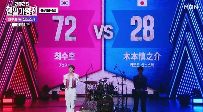 2일 MBN '2025 한일가왕전'에선 최수호 대 키모토 신노스케의 '순위 탐색전'이 펼쳐졌다.