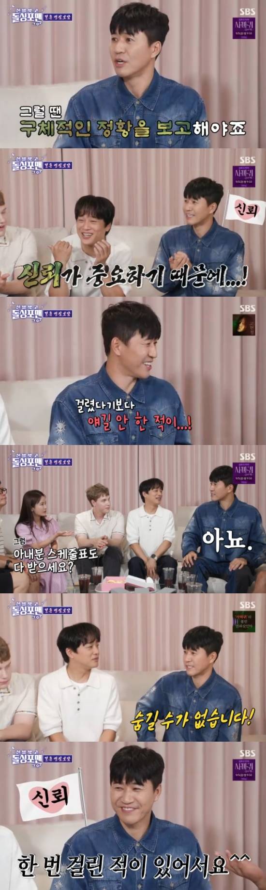 탁재훈은 "너도 점점 불쌍하게 산다. 뭐 걸린 적 있느냐"고 물었고, 김종민은 "놀다가 제대로 얘기를 안 했었다. 그랬더니 '부부사이에는 신뢰가 중요한데 왜 얘기를 안하냐'더라. 그때부터 보고를 시작했다"고 했다.