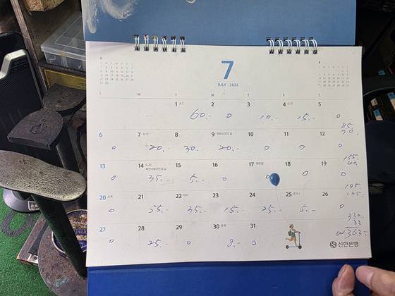 조씨가 달력에 적은 장부를 보니 실제 7월 평일 중 매출이 0원인 날이 8일에 달했다. 그는 “젊었을 땐 이 직업이 영원할 줄 알았다. 이 나이에 다른 일을 새로 배울 수도 없으니 그냥 버티는 것”이라며 쓴웃음을 지었다.
