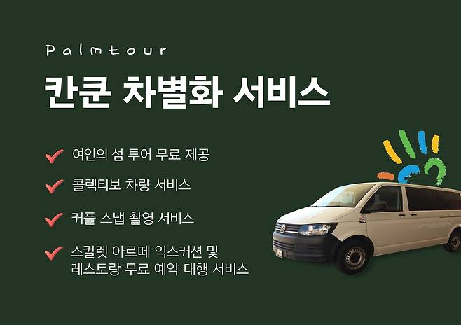 그러나 무료 포함사항이 많고 레스토랑 수와 즐길거리가 무궁무진한 칸쿤 특성상 자유여행으로는 예약과 취소, 변경 등 행정처리를 직접 해야 해서 여행에 집중할 수 없다. 복잡한 레스토랑 예약부터 투어 사전 등록까지 전문 여행사들이 대신 해주는 서비스가 늘고 있다. 허니문 전문 여행사 팜투어의 경우, 인기 리조트 스칼렛 아르떼의 레스토랑, 액티비티 예약, 변경은 물론, 원하는 시간에 이동할 수 있는 고급 승합차인 콜렉티보(Colectivo) 차량을 원할 때 언제나 이용할 수 있도록 서비스의 격을 높였다. 현지에서 후기만 써도 여인의 섬 투어를 무료로 즐기며, 커플 스냅 촬영도 할 수 있는 점도 팜투어만이 제공하는 차별적인 혜택이다.