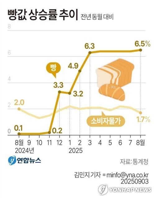 빵값은 지난해 4월부터 11월까지는 1% 미만 상승률을 기록했으나, 12월 3.3%, 올해 1월 3.2%, 2월 4.9%로 오르더니 3월부터는 6개월 연속 6%대 상승률을 유지하고 있다. 3월에 6.3%로 껑충 뛰었고 4~7월은 각 6.4%였다.