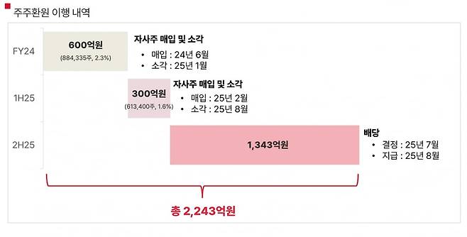 무엇보다 주주환원에 적극적이다. 회사는 7월 말 주당 3590원의 중간 현금배당을 실시했다. 배당금 총액만 1343억 원이다. ‘비과세 배당’ 방식으로 진행돼 개인 주주의 실수령액이 크게 늘어날 수 있다는 점이 특징으로 꼽혔다. 자본준비금을 이익잉여금으로 전환해 배당 재원으로 활용한 결과다. 해당 방식에 따라 개인 주주는 15.4%의 원천징수를 피할 수 있다. 금융소득 종합과세 대상에서도 제외된다. 여기에 자사주 61만3400주(전체 발행주식의 1.61%)를 전량 소각하기로 결정했다. 앞서 에이피알은 지난해와 올해 각각 600억 원, 300억 원 규모의 자사주를 매입해 일부를 소각한 바 있다. 지난해 기준 에이피알의 주주환원율은 55.7%에 달한다.
