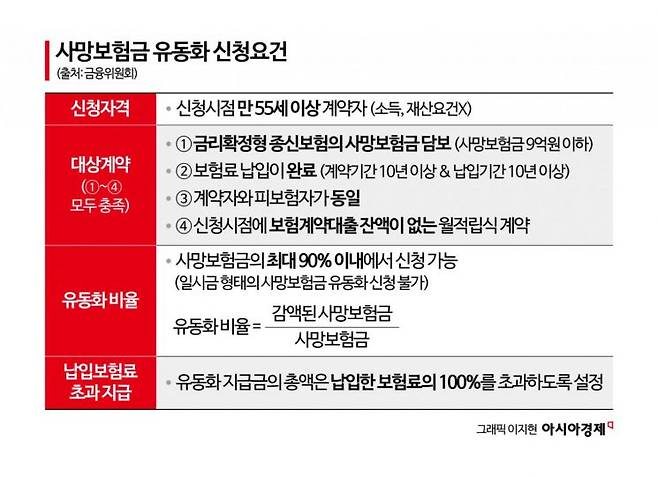 사망보험금 유동화는 만 55세 이상부터 가능하다. 향후 국민연금 수급연령이 65세로 점차 상향되는 등 은퇴시점과 연금수령 개시시점 사이에 소득공백이 생길 우려가 커지자 유동화 가능 연령을 65세에서 55세로 확대했다. 사망보험금이 9억원 이하인 금리확정형 종신보험 계약자들은 소득이나 재산요건 없이 신청 가능하다. 계약기간과 납입기간은 10년 이상을 채워야 한다. 계약자와 피보험자가 동일해야 하고 신청시점에 보험계약대출 잔액이 있으면 안 된다.