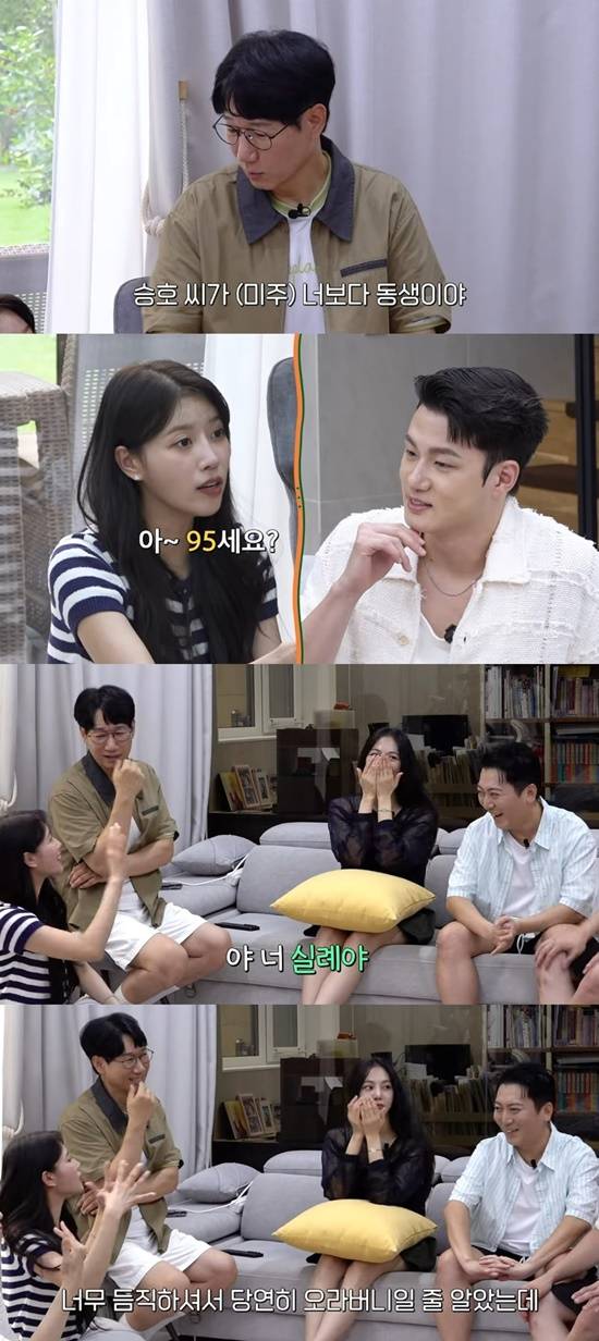 이날 지석진은 이미주를 향해 "신승호 씨가 너보다 동생이다"라고 말했고, 1994년생인 이미주는 "아, 95세요?"라며 "허억"하고 놀랐다.