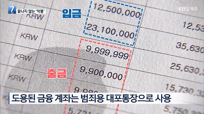 한 번에 수천만 원이 입금되고 990만 원씩 나눠서 출금된 수많은 거래 내용, 대포통장으로 쓰였던 겁니다.