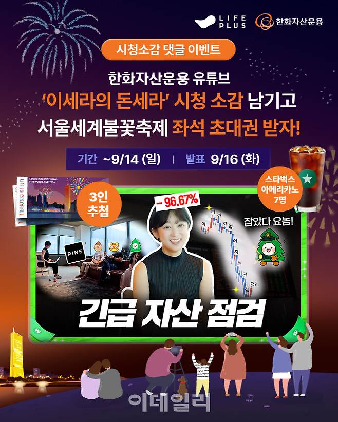 한화자산운용은 이벤트 신청 고객 중 3명을 추첨해 불꽃축제 관람 티켓(1인 2매)을 증정한다. 당첨자는 이달 16일 한화자산운용 유튜브 채널 커뮤니티 공지를 통해 확인할 수 있다.
