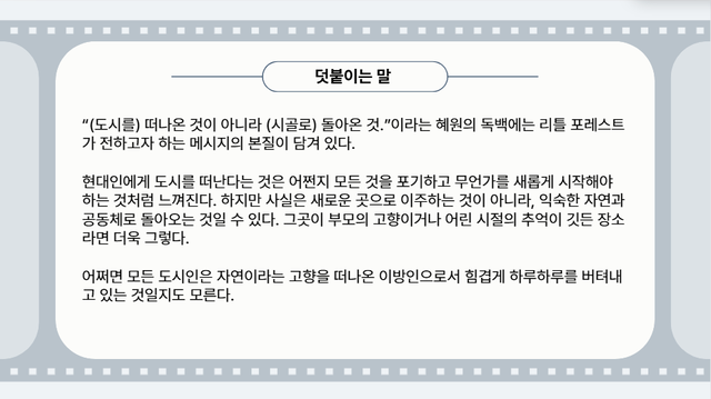 짧은 독백은 영화 전체를 관통하는 핵심 메시지이자, 고향이 주는 치유와 회복의 의미를 상징한다.