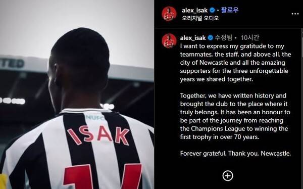 그리고 같은 날 리버풀행이 확정되자 이사크는 개인 SNS를 통해 작별 인사를 남겼다.