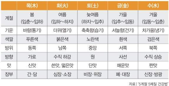 이를테면 2월 4일쯤(입춘)~5월 5일쯤(입하) 사이에 태어난 이는 봄체질에 해당한다. 이들은 목(木)으로 상징되는 봄 에너지가 강한 시기에 태어났기 때문에 선천적으로 오장육부 중 간과 담 기능이 다른 장부에 비해 약한 편이다. 외부의 강력한 봄기운에 적응하려고 신체 내부에서는 봄에 해당하는 간과 담의 기능을 상대적으로 약화시킨 결과다. 따라서 봄체질은 봄기운에 해당하는 색깔, 음식, 기운, 방위 등을 적극적으로 받아들이는 게 건강한 생활을 유지하고 경쟁력 있는 삶을 살아가는 데 도움이 된다.