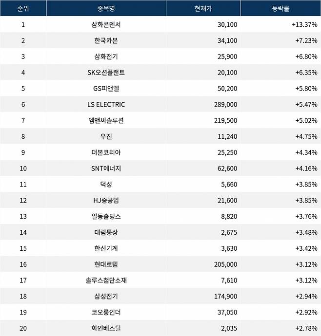 6위 LS ELECTRIC(010120)은 현재가 289,000원으로 5.47% 상승 중이다. 7위 엠앤씨솔루션(484870)은 현재가 219,500원으로 5.02% 상승 중이다. 8위 우진(105840)은 현재가 11,240원으로 4.75% 상승 중이다. 9위 더본코리아(475560)는 현재가 25,250원으로 4.34% 상승 중이다. 10위 SNT에너지(100840)는 현재가 62,600원으로 4.16% 상승 중이다.