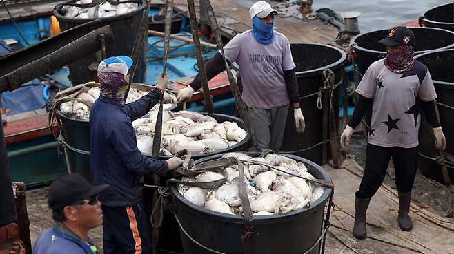 ▲ 지난 1일 경남 남해군 미조면 항구에서 어부가 폐사한 참돔 수거를 위해 대기하고 있다.