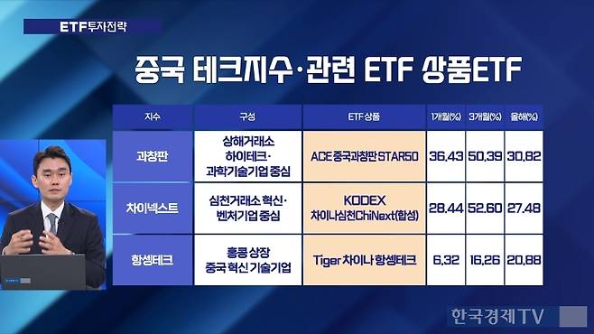 중국 증시가 AI 모멘텀으로 강세를 보이고 있는 가운데 관련 ETF에 대한 관심이 커지고 있다. 정성인 키움투자자산운용 ETF 사업부장은 오늘(3일) 한국경제TV에 출연해 "중국 대표 지수인 CSI300을 추종하는 ETF 중에서는 미래에셋자산운용의 TIGER 차이나CSI300이 연초 이후 13% 상승하며 좋은 성적을 내고 있다"며 "중국 증시 강세의 주요 요인으로는 AI 모멘텀이 꼽힌다"고 말했다. 특히 "과학창업판(과창판)과 차이넥스트 지수가 역대급 랠리를 펼치고 있는데, 이를 추종하는 ETF로는 한국투자신탁운용의 ACE 중국과창판STAR50, 삼성자산운용의 KODEX 차이나심천ChiNext 등이 있다"고 설명했다. 정성인 부장은 "중국의 대형 기술주들을 담은 홍콩H지수(항셍테크) ETF는 상대적으로 덜 오른 상태"라며 "따라서 매수를 고려한다면 항셍테크 ETF를 추천한다"고 조언했다. 한편 국내 시장에서는 고배당 ETF들이 인기를 끌고 있다. 정성인 부장은 "키움투자자산운용의 KIWOOM 고배당, NH아문디자산운용의 PLUS 고배당주, 삼성자산운용의 KODEX 증권, 미래에셋자산운용의 TIGER 지주회사 등이 대표적"이라며 "최근에는 KB자산운용의 KBSTAR Fn금융고배당, 신한자산운용의 SOL KRX300금융고배당 등 금융 업종 내 고배당 종목에만 집중 투자하는 ETF들도 상장됐다"고 전했다. ● 핵심 포인트 - 중국 대표 지수인 CSI300을 추종하는 ETF로는 TIGER 차이나CSI300이 있으며, 올해 1개월 수익률이 13%로 좋음. - 중국 증시 강세의 주요 요인은 AI 모멘텀으로, 특히 과창판과 차이넥스트 지수가 역대급 랠리를 펼치고 있음. - 과창판을 추종하는 ETF로는 ACE 중국과창판STAR50, 차이넥스트를 추종하는 ETF로는 KODEX 차이나심천ChiNext가 있음. - 중국의 빅테크 기업들을 담은 항셍테크 ETF는 상대적으로 덜 올랐으며, 매수를 고려한다면 항셍테크 ETF를 추천함. - 국내 고배당 ETF로는 KIWOOM 고배당, PLUS 고배당주, KODEX 증권, TIGER 지주회사 등이 있으며, 최근에는 금융 고배당, 은행 고배당 상품들도 상장됨.