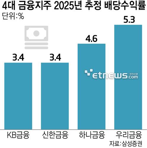 우리금융지주도 배당 중심 주주환원을 이어가고 있다. 우리금융은 상반기 기준 배당 4000억원을 실시했다. 특히 직전 3년 평균 대비 배당이 5% 이상 증가하며 올해 배당 성향 25%를 넘겨 30.3%에 이를 것으로 전망된다. 배당수익률 역시 3% 이상으로 예상되며 시장 기대감을 높이고 있다.