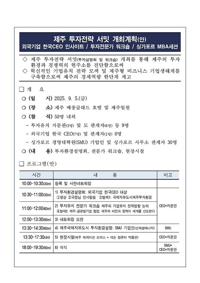 이번 행사는 제주의 투자환경과 경쟁력을 진단하고 기업 유치 전략을 모색하기 위한 자리다. 특히, 신산업 분야 투자유치에 중점을 둔다.