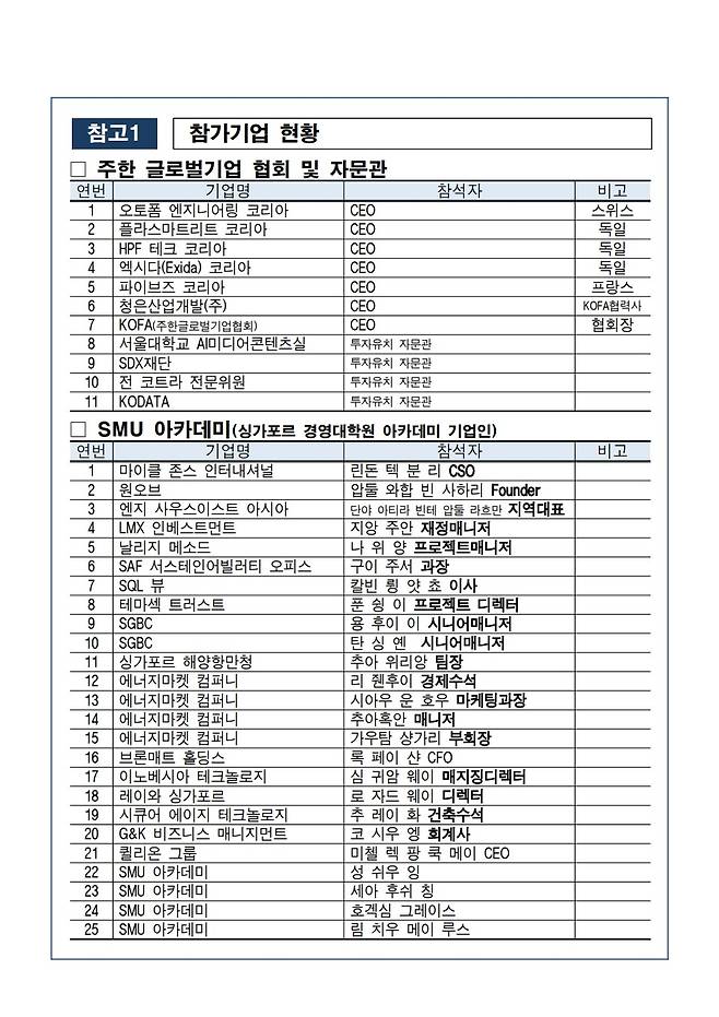 참석자는 스위스, 독일 등 글로벌 기업 한국법인의 최고경영자와 국내 협력사 대표들이 포함된다. 싱가포르에서는 에너지, 해양, 금융 등 다양한 산업 분야의 경영학석사(MBA) 출신 기업인들이 참여한다.