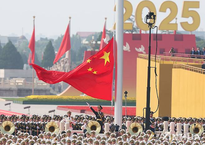 [베이징=신화/뉴시스] 3일(현지 시간) 중국 베이징 톈안먼(천안문)광장에서 열린 '중국 인민 항일 전쟁 및 세계 반파시스트 전쟁 승리(전승절)' 80주년 기념 열병식에서 중국 국기가 게양되고 있다. 2025.09.03.