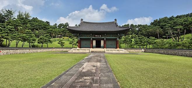 이제 묘소 아래로 내려가 홍살문을 지난다. 긴 진입로를 따라 중문을 넘었다. 네모지게 빙 두른 담장 안 마당 끝에 단층의 사당 건물이 있었다. 거기까진 신과 인간이 함께 걷도록 만든 삼도길이 이어져 있다. 가운데를 밟지 않으려 조심하며 앞으로 나아간다.