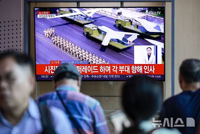 [서울=뉴시스] 정병혁 기자 = 3일 서울 중구 서울역에서 시민들이 중국 전승절 열병식 행사 관련 뉴스를 시청하고 있다. 2025.09.03. jhope@newsis.com