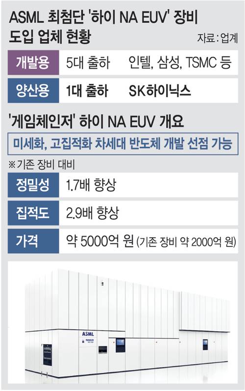 ‘하이 NA EUV’는 기존 EUV 장비보다 해상도를 크게 높인 차세대 반도체 노광장비로, 현존 장비 중 가장 미세한 회로 패턴 구현이 가능해 선폭 축소 및 집적도 향상에 핵심 역할을 한다. 한 대당 가격이 5000억 원을 넘는 초고가 장비로, 삼성전자와 대만 TSMC·미국 인텔 등 일부 글로벌 반도체 기업만 개발용으로 보유하고 있다.