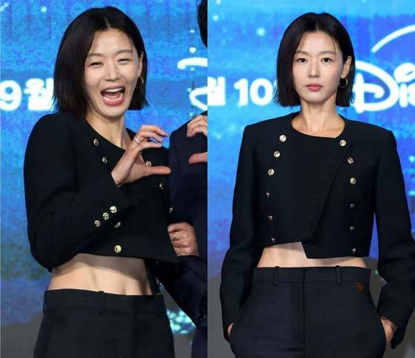 이날 제작발표회에서 전지현은 짧은 기장의 크롭 재킷을 입어 선명한 복근을 드러냈다.
