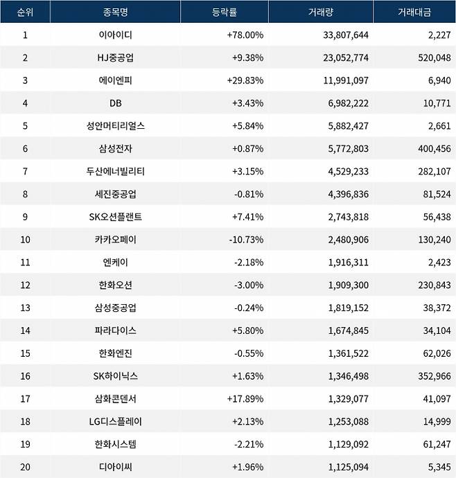 한편 거래량 상위 20위권 종목들은 엔케이(085310) ▼2.18%, 한화오션(042660) ▼3.00%, 삼성중공업(010140) ▼0.24%, 파라다이스(034230) ▲5.80%, 한화엔진(082740) ▼0.55%, SK하이닉스(000660) ▲1.63%, 삼화콘덴서(001820) ▲17.89%, LG디스플레이(034220) ▲2.13%, 한화시스템(272210) ▼2.21%, 디아이씨(092200) ▲1.96% 등의 성적을 기록했다.