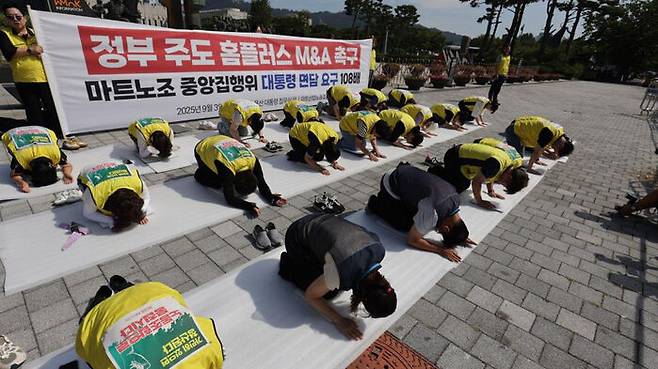 마트노조 홈플러스지부는 이날 오전 용산 대통령실 앞에서 이재명 대통령 면담과 정부 주도의 인수·합병(M&A)을 촉구하며 108배를 하는 행사도 했습니다.