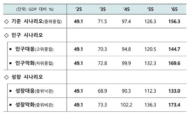 정부가 생산성을 끌어올리는 등 성장률 대응에 성공하는 경우 2065년 국가채무비율은 133.0%지만, 성장률이 악화할 경우엔 173.4%까지 치솟는 것으로 나타났습니다.