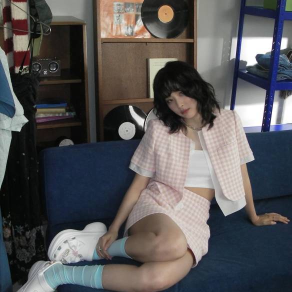 컬러와 스타일에 따라 무궁무진한 매력을 뽐내는 깅엄 체크 아이템! 늦여름부터 더위가 가시지 않은 초가을까지 입기 좋은 스타일링을 소개합니다. 슬기는 파스텔 핑크 깅엄 셋업으로 단정하면서도 귀여운 룩을 선보였는데요. 핑크 컬러와 상반되는 블루 컬러 양말을 포인트로 매치해 통통 튀는 스타일링을 완성했습니다.