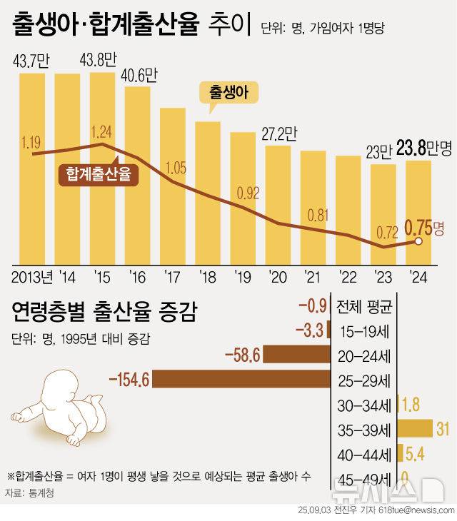 [서울=뉴시스] 3일 통계청에 따르면 출생아 수는 1995년 71만5000명에서 감소 추세를 보이다가 2023년 23만명으로 최저를 기록한 후 지난해 23만8000명으로 오랜만에 반등했다. 여자 1명이 평생 낳을 것으로 예상되는 평균 출생아 수를 의미하는 합계출산율은 1.63명에서 0.75명으로 0.89명 감소했다. 30년 간 20대 후반(-154.6명) 및 20대 초반(-58.6명)에서 감소한 반면 30대 후반(31.0명)에서는 증가했다. (그래픽=전진우 기자)