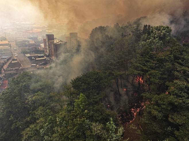 | ▲ 지난 4월 28일 오후 2시 1분께 대구 북구 노곡동 함지산에서 발생한 산불이 인근인 조야동 민가까지 확산하고 있다. |