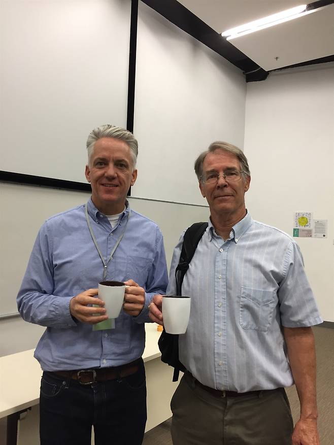 | ▲ 지난 2018년 홍콩 컨퍼런스에서, 필자(왼쪽)와 킴 스탠리 로빈슨(오른쪽) 작가의 모습. |