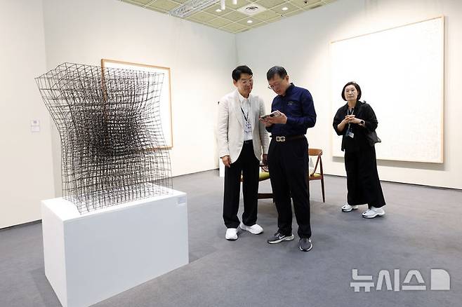 [서울=뉴시스] 박진희 기자 = 도형태(왼쪽) 갤러리현대 대표가 '프리즈 서울(FRIEZE SEOUL)' 아트페어가 개막한 3일 서울 강남구 코엑스 갤러리현대 전시장을 찾은 관람객에게 작품 설명을 하고 있다. 2025.09.03. pak7130@newsis.com