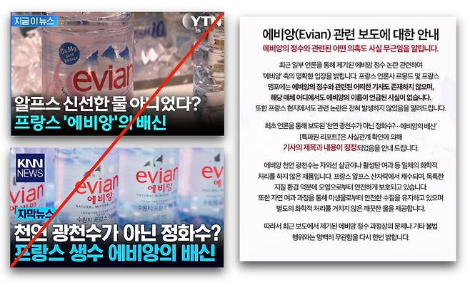 지난해 초 프랑스에서 세계 1위 생수 업체인 네슬레 워터스가 '천연 광천수'를 불법 정수해온 사실이 드러나 큰 파장이 일고 있는 가운데, 우리나라에선 그 불똥이 네슬레와 무관한 '에비앙'으로 튀었다. KBS 특파원의 최근 오보 때문이다.
