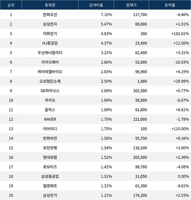 이어 검색비율 2위의 삼성전자(005930)는 상승률 1.01%로 마감했다. 검색비율 3위의 이화전기(024810)는 182.61% 급등 마감했다. 검색비율 4위 HJ중공업(097230)은 12.50% 상승했다. 검색비율 5위 두산에너빌리티(034020)는 3.31% 상승했다.