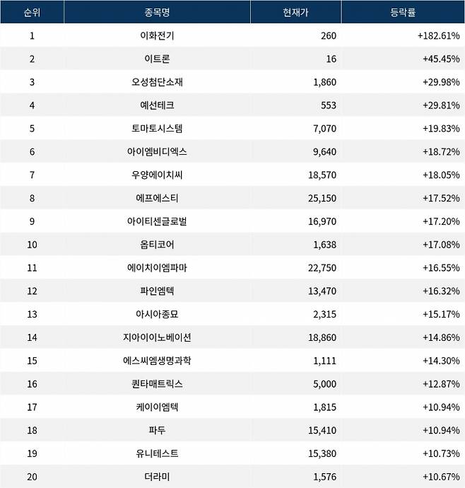 [서울데이터랩]이화전기 182.61% 폭등…금일 증시 상승률 1위로 마감