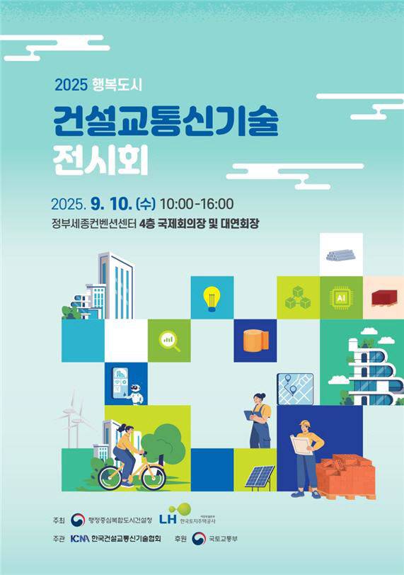 행정중심복합도시건설청(청장 강주엽·이하 행복청)은 9월 10일 오전 10시부터 오후 4시까지 정부세종컨벤션센터에서 '행복도시 건설·교통 신기술 전시회'를 개최한다고 3일 밝혔다.
