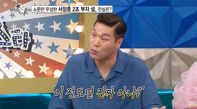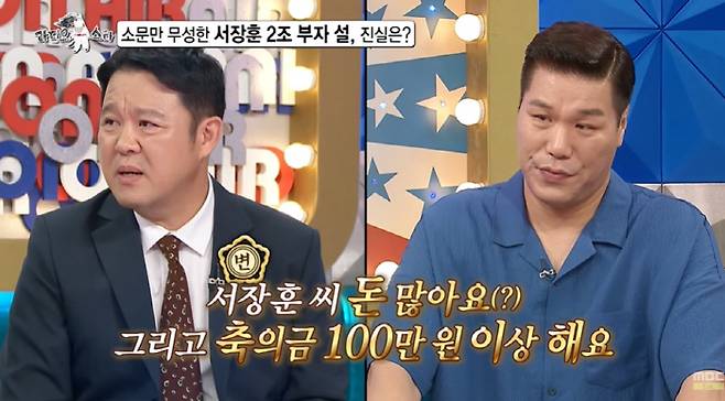 서장훈은 "처음에는 2조가 아니었다. 2천억에서 3천억, 5천억, 1조, 2조까지 불어났다"면서 "2조 이야기를 계속 하니까 내가 볼 때 100명 중 5명까지는 믿는 것 같다"며 재산 루머를 언급했다. 이에 신동은 "더 많이 믿는다"고 했고, 김국진은 "나도 믿는다"며 웃었다.