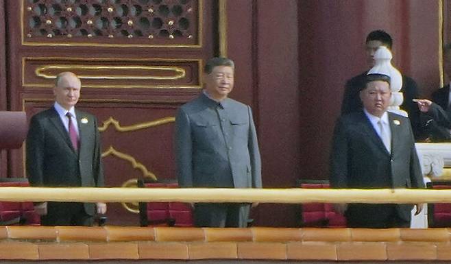 ▲ 블라디미르 푸틴 러시아 대통령과 시진핑 중국 국가 주석, 김정은 북한 국무위원장이 3일 중국 베이징 톈안먼광장에서 열린 전승절 80주년 기념 대규모 열병식에 참석했다.