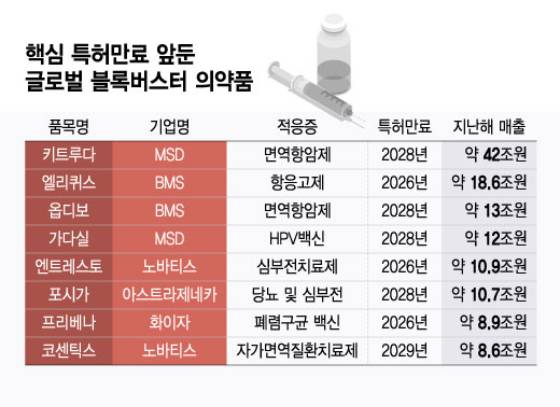 특허 절벽은 주요 의약품의 특허가 만료되면서 해당 약물이 더 이상 독점 판매되지 못하고 복제약·바이오시밀러의 등장으로 매출이 급격히 감소하는 현상을 말한다. 향후 5년간 특허가 만료되는 블록버스터 의약품으로는 지난해 약 42조원의 매출로 글로벌 매출 1위를 기록한 머크(MSD) 면역항암제 '키트루다'(2028년)를 비롯해 △BMS 항응고제 '엘리퀴스'(2026년) △BMS 면역항암제 '옵디보'(2028년) △MSD HPV 백신 '가다실'(2028년) △노바티스 심부전치료제 '엔트레스토'(2026년) 등이다. 나란히 연간 50억달러(약 6조9700억원) 이상의 매출을 거두는 품목들이다.