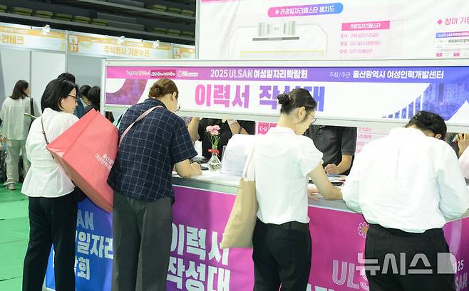 [울산=뉴시스] 배병수 기자 = 3일 울산 남구 문수체육관에서 열린 2025년 울산 여성 일자리박람회에서 구직자들이 이력서를 작성하고 있다. 2025.09.03.bbs@newsis.com.