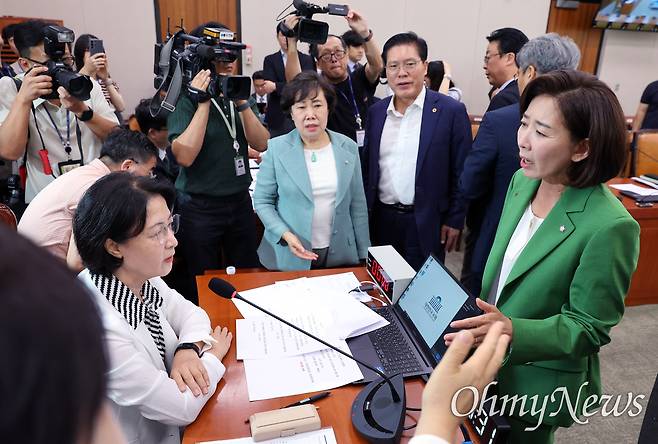 | ▲ 법사위서 충돌한 나경원-추미애 추미애 국회 법제사법위원장이 2일 서울 여의도 국회에서 열린 법제사법위원회 전체회의에서 나경원 국민의힘 의원의 의사진행발언 신청을 들어주지 않자, 나 의원을 비롯한 국민의힘 의원들이 위원장석으로 나와 항의하고 있다. |