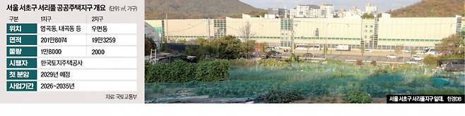 전략환경영향평가는 개발기본계획을 수립하기 전 환경 측면에서 계획 적정성과 입지 타당성 등을 검토하는 절차다. 초안에 따르면 정부는 서리풀1지구 201만8074㎡에 1만8000가구, 서리풀2지구 19만3259㎡에 2000가구를 공급한다. 전체 2만 가구 중 1만1000가구는 신혼부부용 장기전세주택인 ‘미리내집’으로 조성한다. 사업시행자는 LH(한국토지주택공사)다. 첫 분양은 2029년, 사업 완료는 2035년 예정이다.