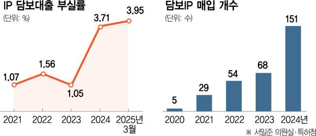 3일 서일준 국민의힘 의원실이 특허청에서 제출받은 자료에 따르면 IP 담보대출 부실률은 2023년까지 1.05% 수준을 유지했지만 2024년 3.71%로 급등한 뒤 올해 3월에는 3.95%까지 치솟았다. 부실액은 846억 원에 달한다.