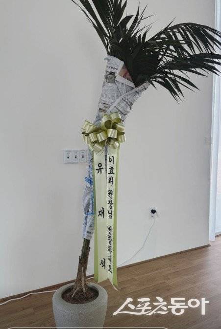 사진 속에는 유재석의 이름과 함께 “이효리 원장님 번창하세요”라며 요가원 개원을 축하하는 ‘센스’있는 문구가 담겼다.